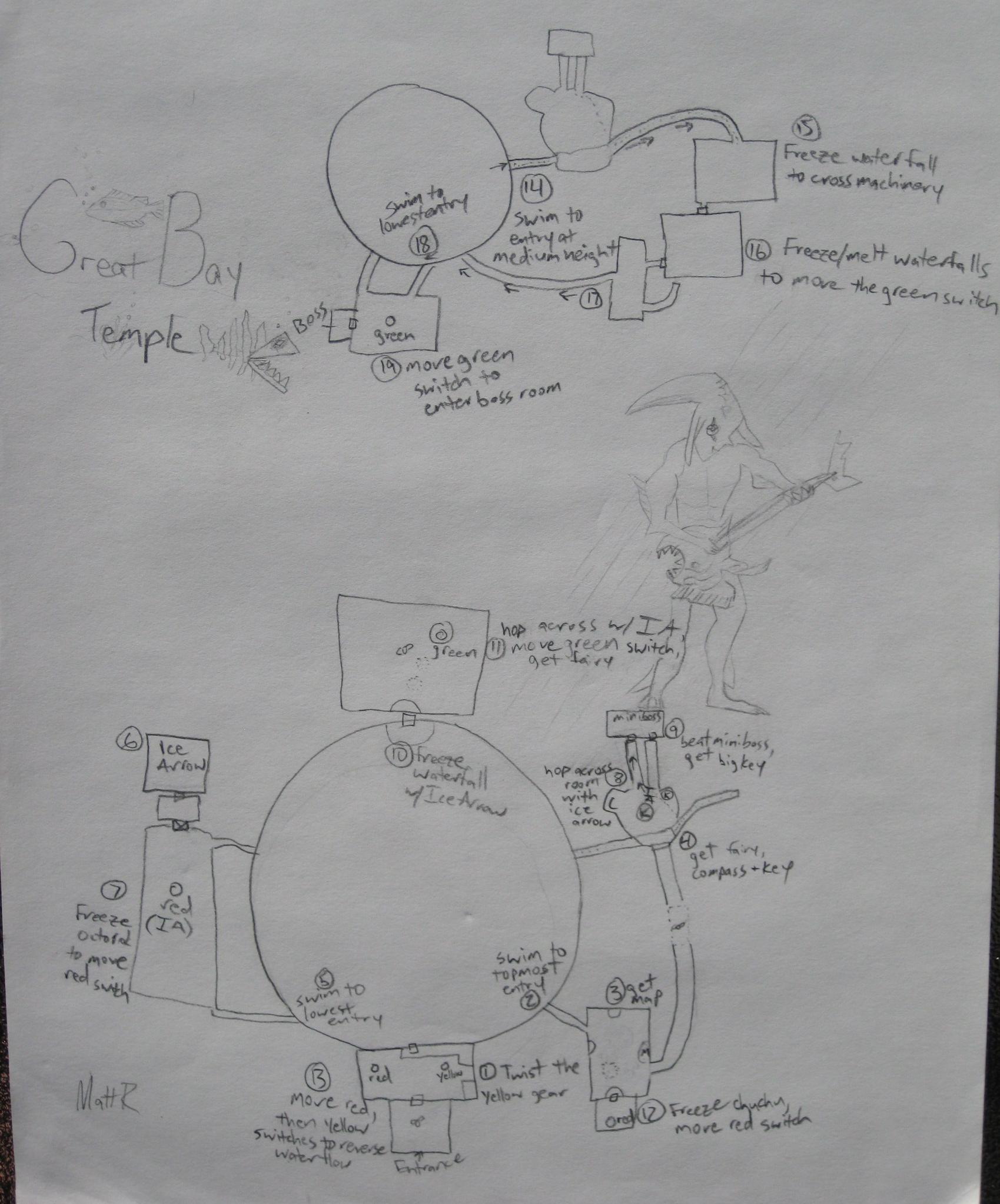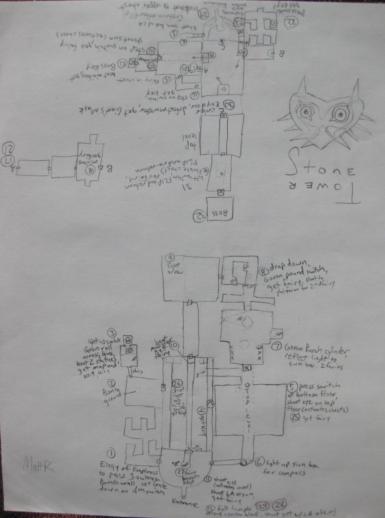 Keeping track of a huge overworld was the main challenge for early Zelda games, but the difficulty shifted in favor of labyrinthine dungeons/temples in the jump to 3D (Wind Waker being an interesting exception). If you like to play these newer Zeldas more than once then I suggest grabbing a pencil and paper; MM has without a doubt some of the most mind-bending temples of all, and the time limit and terrible pause screen maps only magnify the difficulty. Beyond that, having a physical map makes for a great souvenir in a way that no achievement “trophy” or filled inventory could ever duplicate.