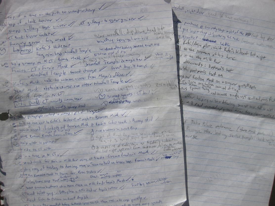 I really liked Majora's Mask for tying sidequests and non-playable characters to the 3-day time mechanic, but finding every single one of the game's heart pieces, equipment upgrades, and masks was made more daunting than in any other Zelda; unfortunately, this meant that careful overworld exploration was replaced by sheer dumb luck in being in the right place at the right time. Getting help from Gamefaqs is one way to get around the tedium if you're a lazy cheater; a good compromise is sticking with ye olde handwritten grocery store checklist: