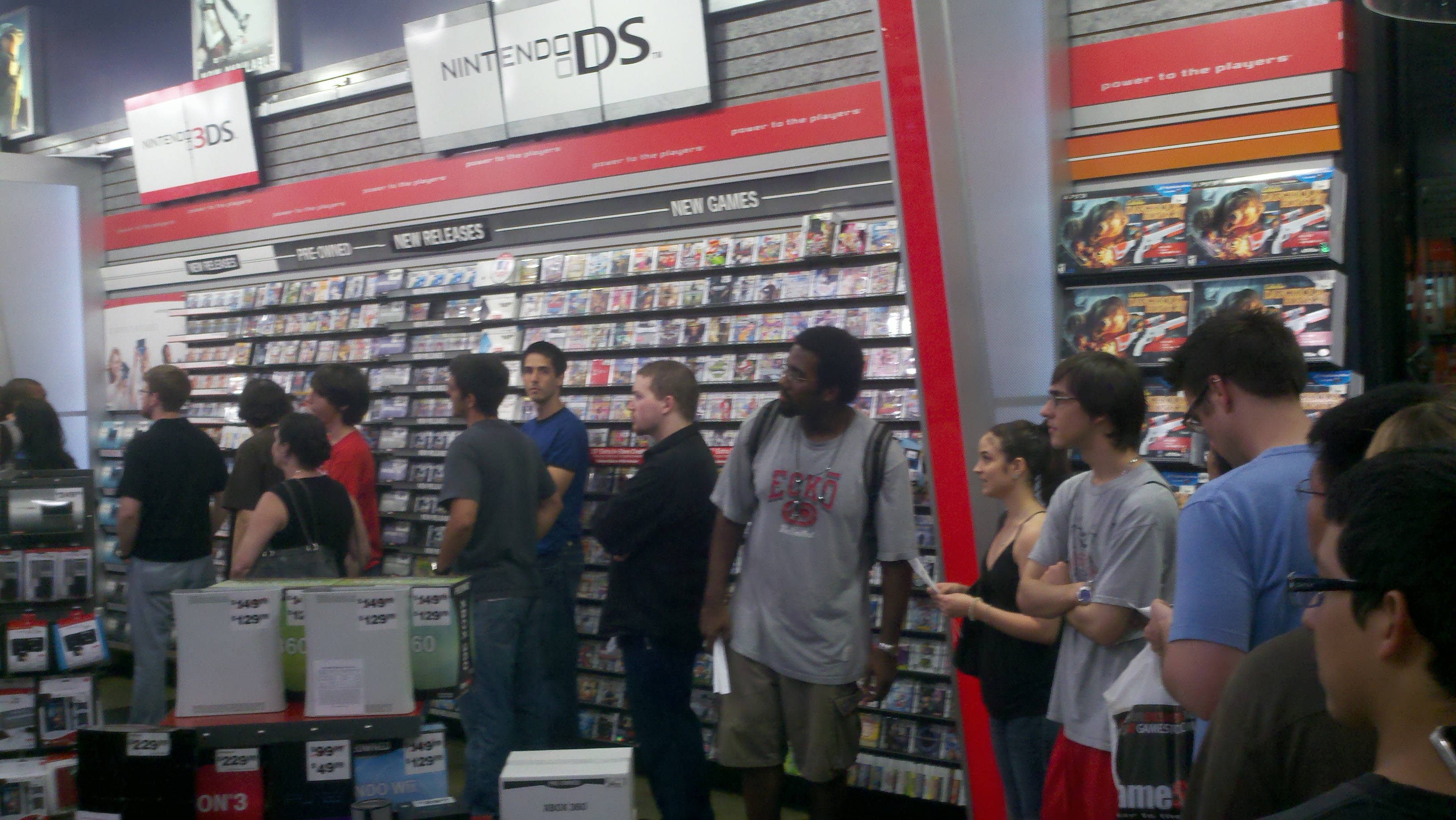 I finally had my 3DS. So did about 40 happy other people or more. GameStop employees suggested they had received over 80 units for launch, a staggering number from my perspective, as I recall most stores receiving much smaller amounts of Wiis (at least in my area) back in 2006.