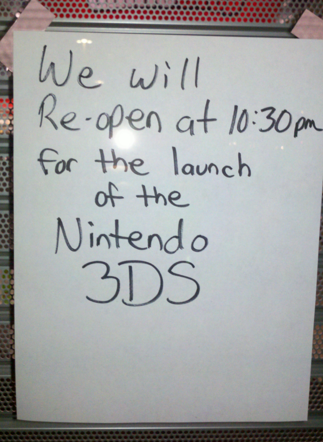 With that, I skedaddled over to GameStop, my Wal*Mart woes behind me, and joined the line. I was about #35, believe it or not, and a guy who jumped in line a few spots behind me counted to 40. In a few moments, we were allowed inside the store, where a few towers of 3DS units could be seen near the back. Shortly after midnight, the GameStop began giving people numbered 3DS boxes that matched receipts, and that was that.