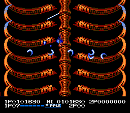 Life Force differs from its predecessor in two significant ways. First, it introduces top-down stages in addition to the standard side-scrolling fare. Second, where Gradius mainly focused on avoiding enemy bullets, Life Force places emphasis on obstacles. As a result, the environments in each area are constantly throwing new biological barriers in your path- which makes sense given that you’re traveling through the body of a giant space serpent.