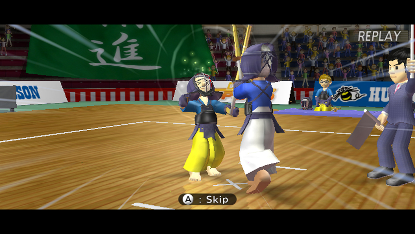 Kendo looks highly intimidating, but is actually very simple to play. Set up similarly to fencing, you have 60 seconds to get two strikes, and then you win. You move with the directional pad, double tap it to lunge, press the A button for a lunging strike and the B button to block. Don't expect something highly similar to real life Kendo, though, as this game is regrettably quick and slightly boring.