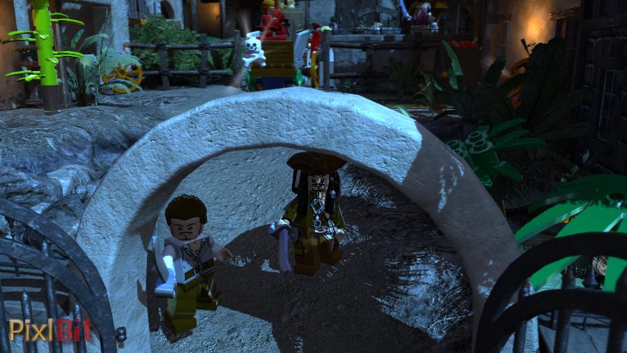 Players control a party of characters throughout the game, each one featuring a crucial ability to either further the plot or unlock hidden extras. Female characters can jump twice, characters with hammers can smack glowing red objects into workable objects and those wielding guns can blast silver obstacles into pieces, opening up new paths. The most unique and useful ability is that of Capt. Jack. His magic compass points out hidden objects, some crucial to getting through the stage.