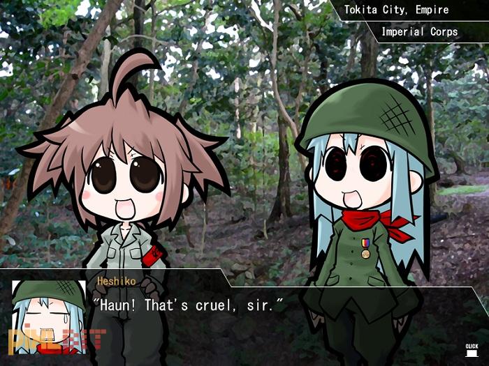 That’s five hours total time on the clock. You must keep in mind that possibly three to four hours of this is filled with some of the most irritating slide-in character text box story telling I’ve ever endured. If you’ve been wondering what the heck a human tank is anyway, it’s a silly idea that I can only assume was created to avoid the moral qualms players might have with shooting real humans on a battlefield as part of a game. Human tanks seem to be man-made humans that are not quite humans, are most definitely not real humans, and also are certainly not humans. Did I mention that human tanks are NOT HUMAN? If that’s not clear, don’t worry: the dialogue will constantly remind you of this fact. The story seems to have been born of this morality dodge and then had a narrative hammered around it with some weak jokes thrown in. It’s all told in front of a rotating series of still photographs with a photoshop paint filter laid atop. The only joy to be had from any of these sequences is the huge variety of written laughs, for example: “Hyo Hyo Hyo,” “hi hi hi,” and my personal fave, “kya kya kya!”
