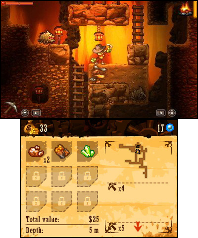 While digging in and of itself can be a chore at first, it’s the progression loop that makes this experience so engaging. As you collect these minerals from the earth, you’ll slowly (or quickly) fill up your pouch, which will force you to the surface to sell off everything you’ve collected. These funds should be properly reinvested in new equipment for Rusty that will make it much quicker and easier to progress through the mine.