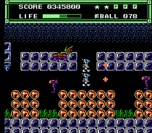 The graphics are very well done and stand out from many other NES games of its time. For the most part, the main character, supporting characters, and enemies are all well-crafted and quite detailed. The game's backgrounds and overall colors are bright and lush, giving Xexyz a relatively upbeat look, considering the game's plot. The boss characters are usually big and imposing, not to mention ugly in that evil sort of way. The sea creature design of many of the bosses reminded me of the Darius series. If you’ve played any of the Darius games, you know what I mean.